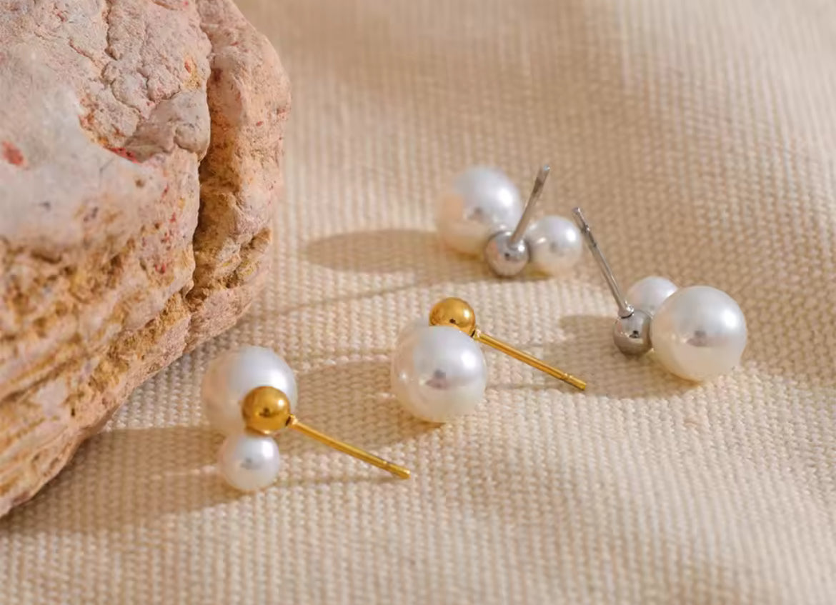 Elegantes aretes de diseño minimalista que combinan la sofisticación de las perlas con la durabilidad del acero inoxidable.