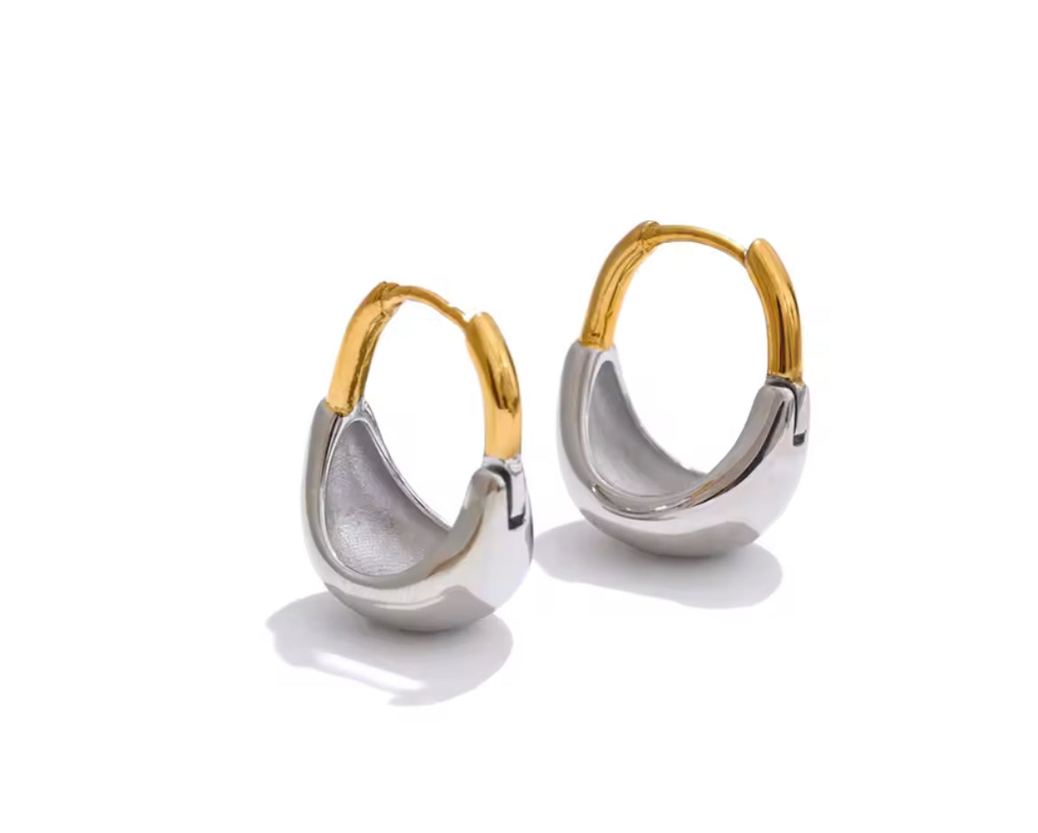 Estos aretes de metal mixto combinan el brillo del oro con la sofisticación de la plata en un diseño moderno tipo argolla que añade personalidad y estilo a cualquier look. Perfectos para quienes aman mezclar metales y crear un estilo único.