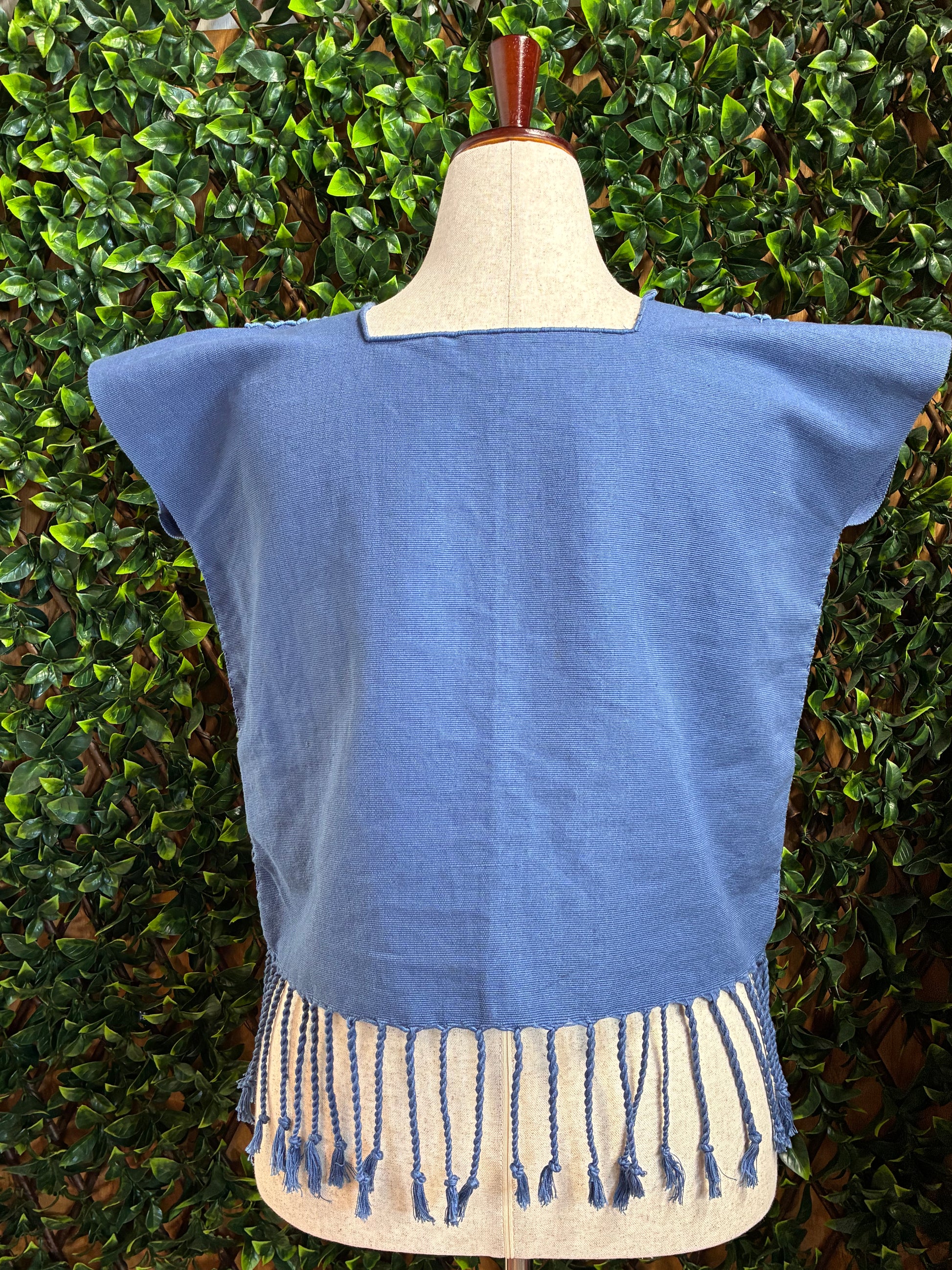 Blusa artesanal tejida a mano en telar de cintura con exquisito bordado rococó monocromático en tonos azules. Una pieza única que celebra la tradición textil mexicana con elegancia contemporánea.