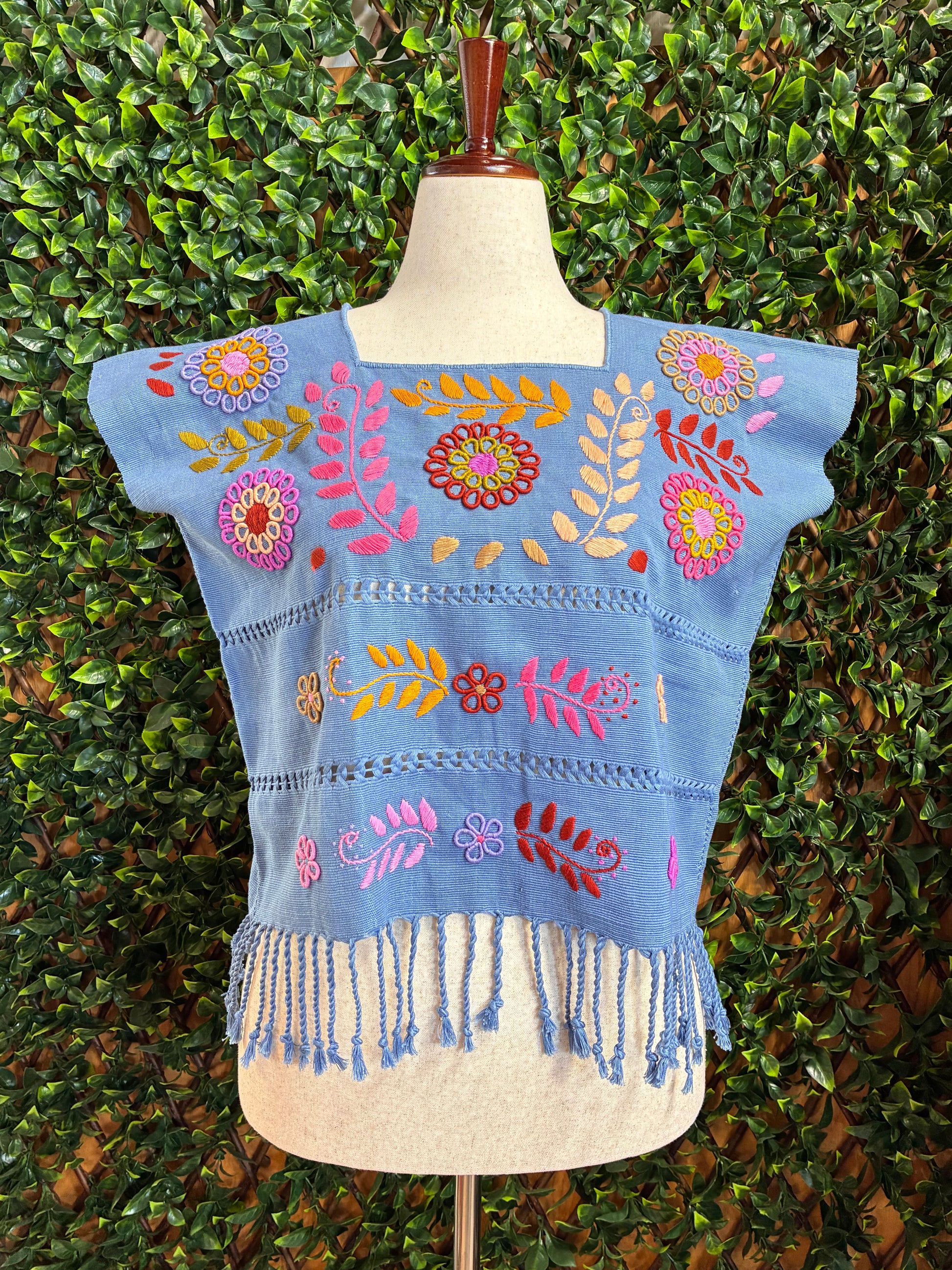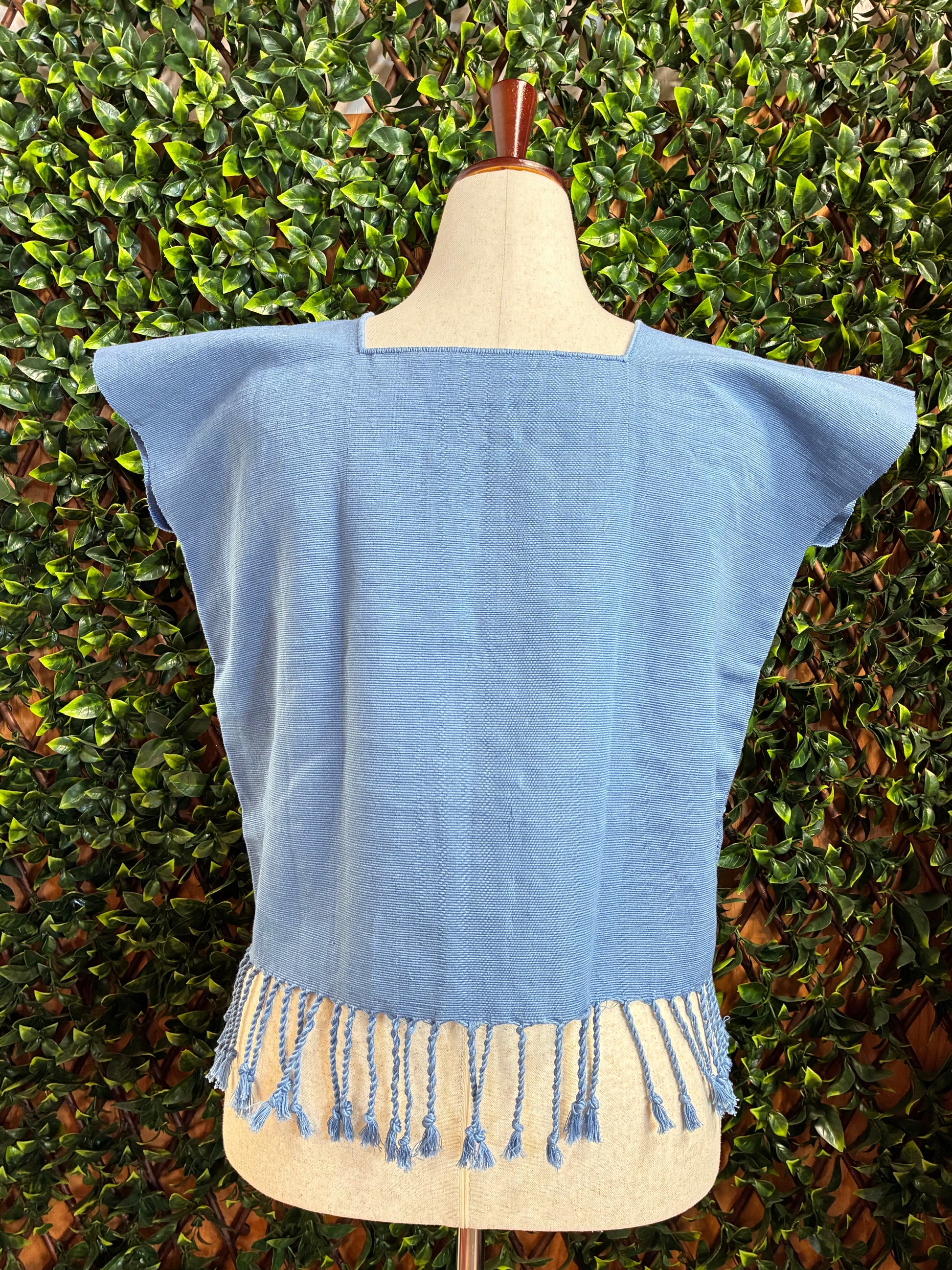 Cada blusa es única y puede presentar ligeras variaciones en el tejido y bordado debido a su elaboración artesanal. Esto es parte del encanto y autenticidad de las piezas hechas a mano. Los colores pueden variar ligeramente debido a la iluminación y configuración de pantalla. La foto en la modelo es solo de referencia para mostrar cómo luce la blusa puesta.