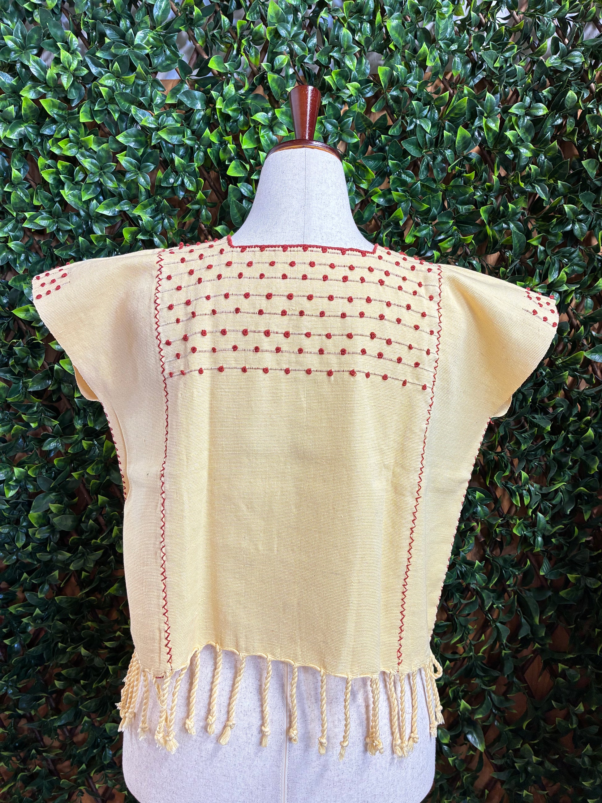 Blusa artesanal tejida a mano en telar de cintura con técnica tradicional mexicana. Esta hermosa pieza presenta un vibrante color amarillo claro con detalles en tono ladrillo utilizando la técnica de nudito, creando una textura única y distintiva.