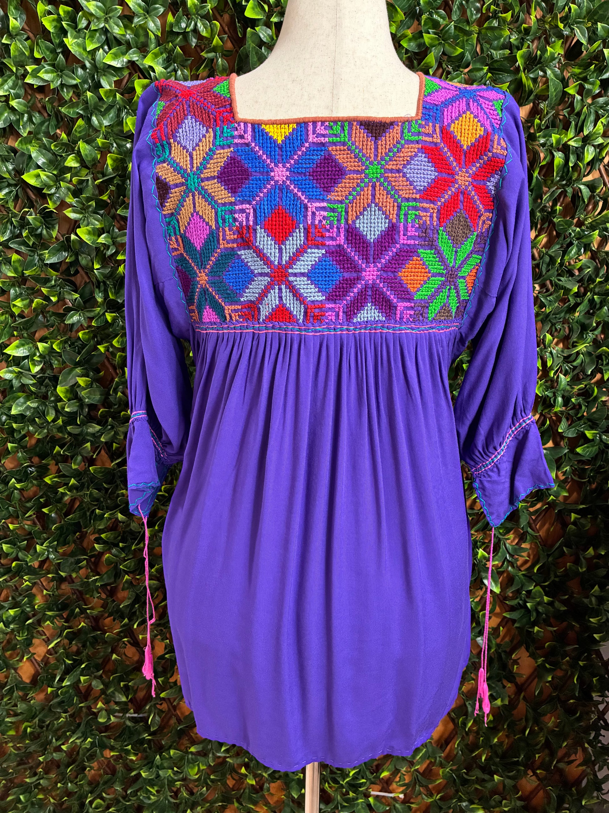 Hermoso blusón artesanal elaborado a mano con exquisitos bordados de punto de cruz en tonos vibrantes de rosa, rojo, verde, amarillo y turquesa sobre base morada.