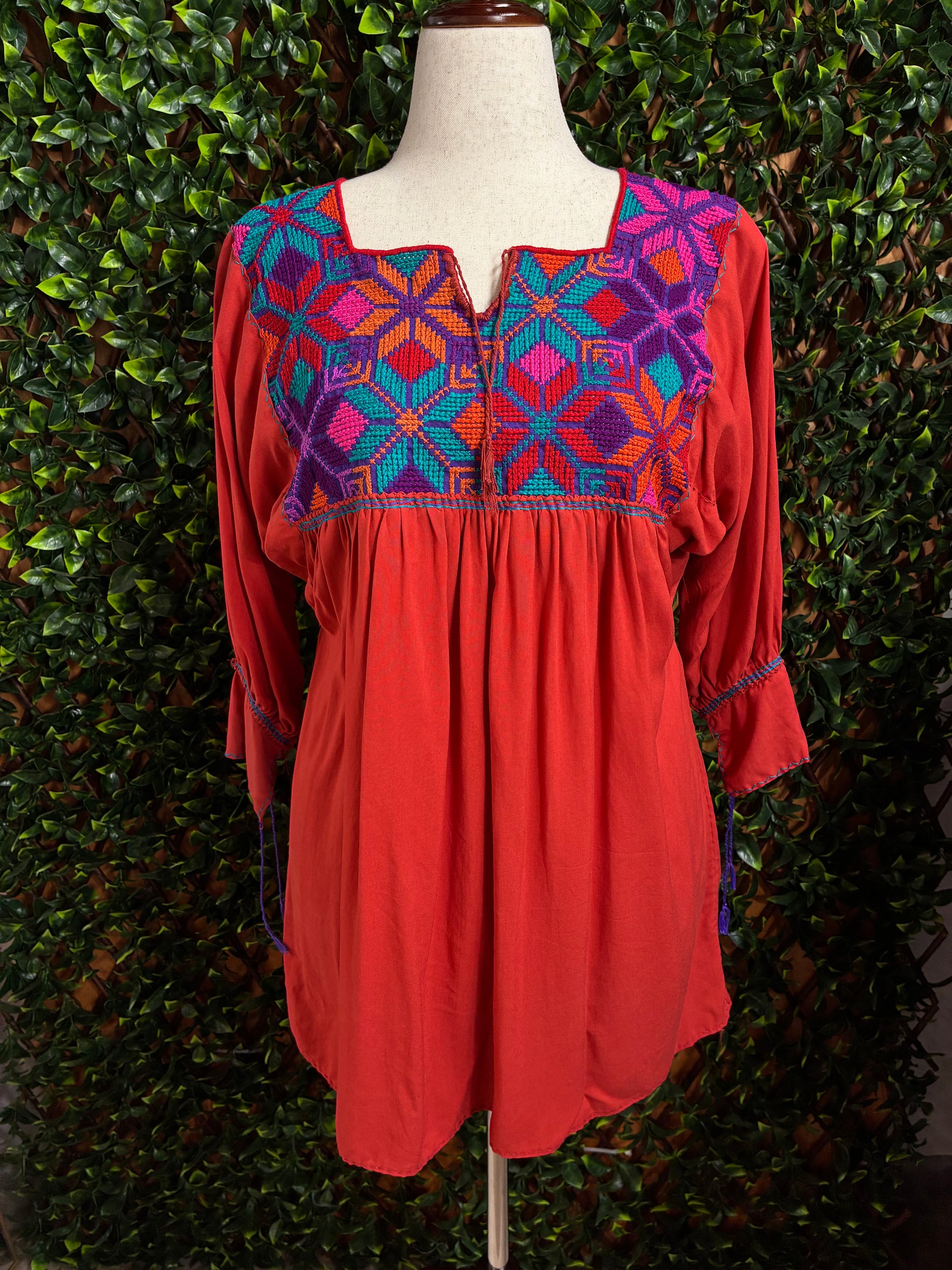 Hermoso blusón artesanal elaborado a mano con exquisitos bordados de punto de cruz en tonos vibrantes de morado, turquesa, rosa, naranja y rojo sobre base color ladrillo.