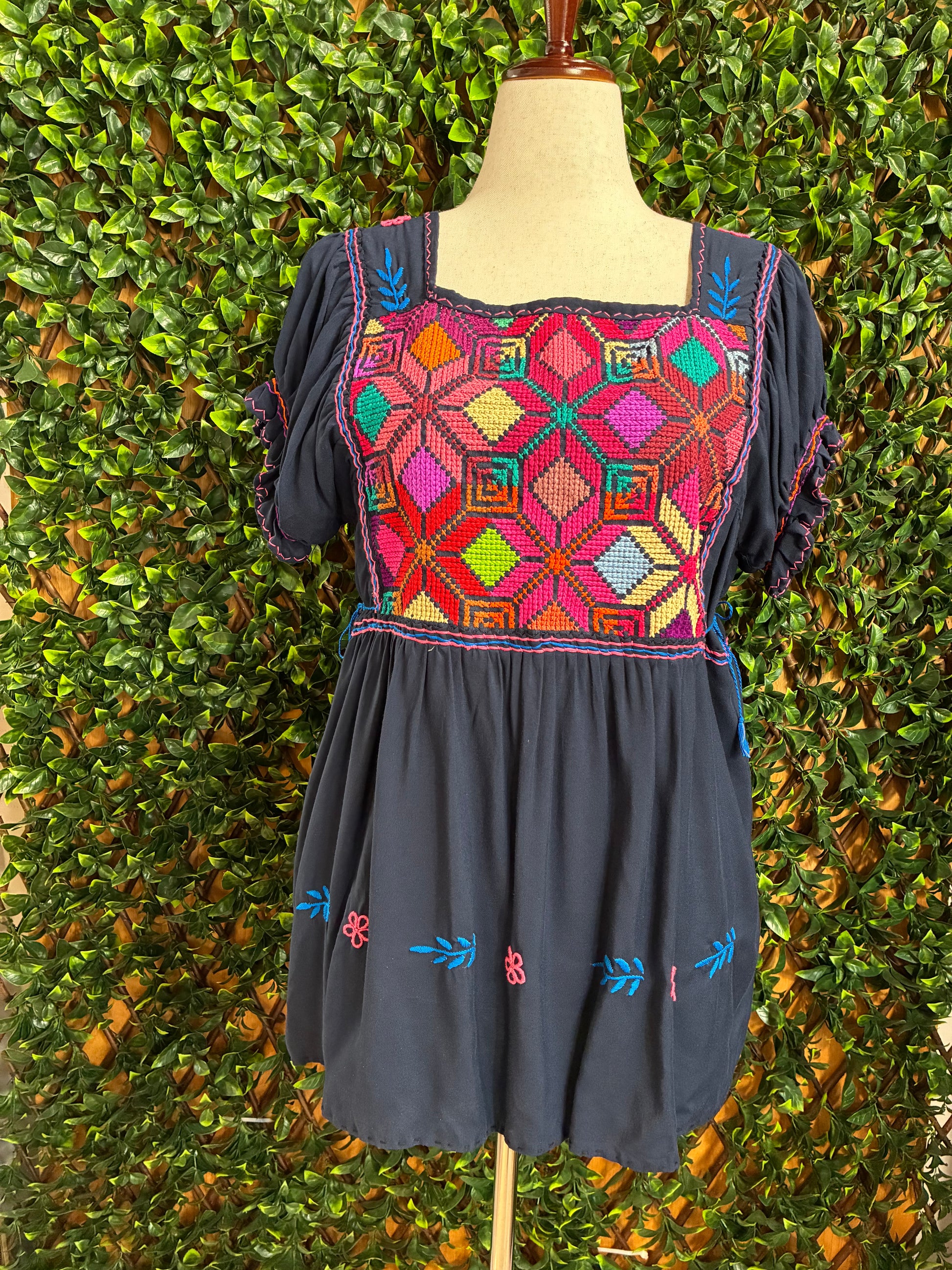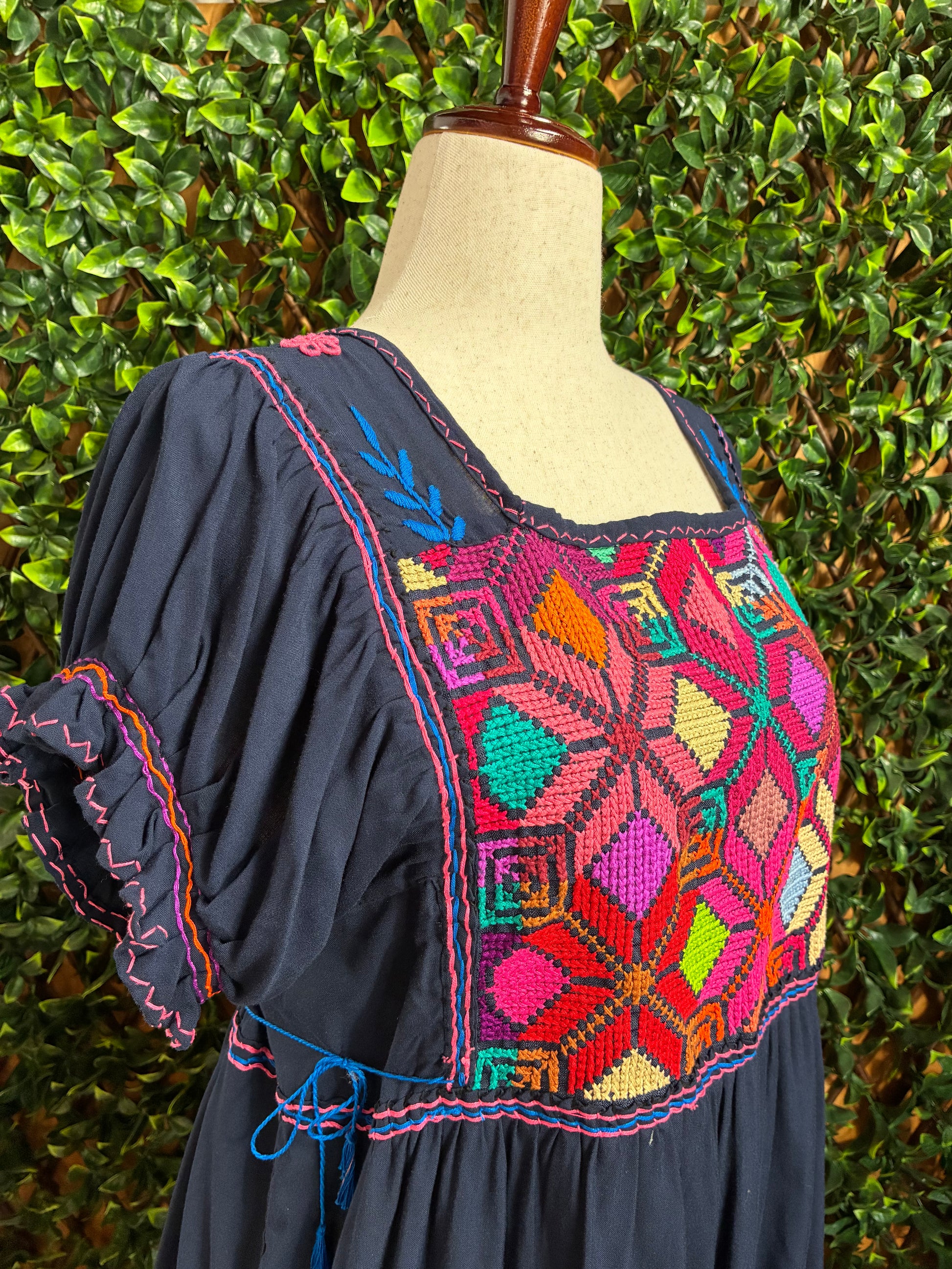 La pechera presenta un espectacular trabajo de punto de cruz con diseños geométricos tipo diamante en tonos vibrantes de rosa, fucsia, naranja, amarillo, verde, turquesa y morado que contrastan bellamente con el azul marino de la base. Los cordones laterales ajustables con borlas decorativas permiten adaptar el blusón a tu figura. Los bordados florales dispersos en la parte inferior añaden un toque de color y movimiento.