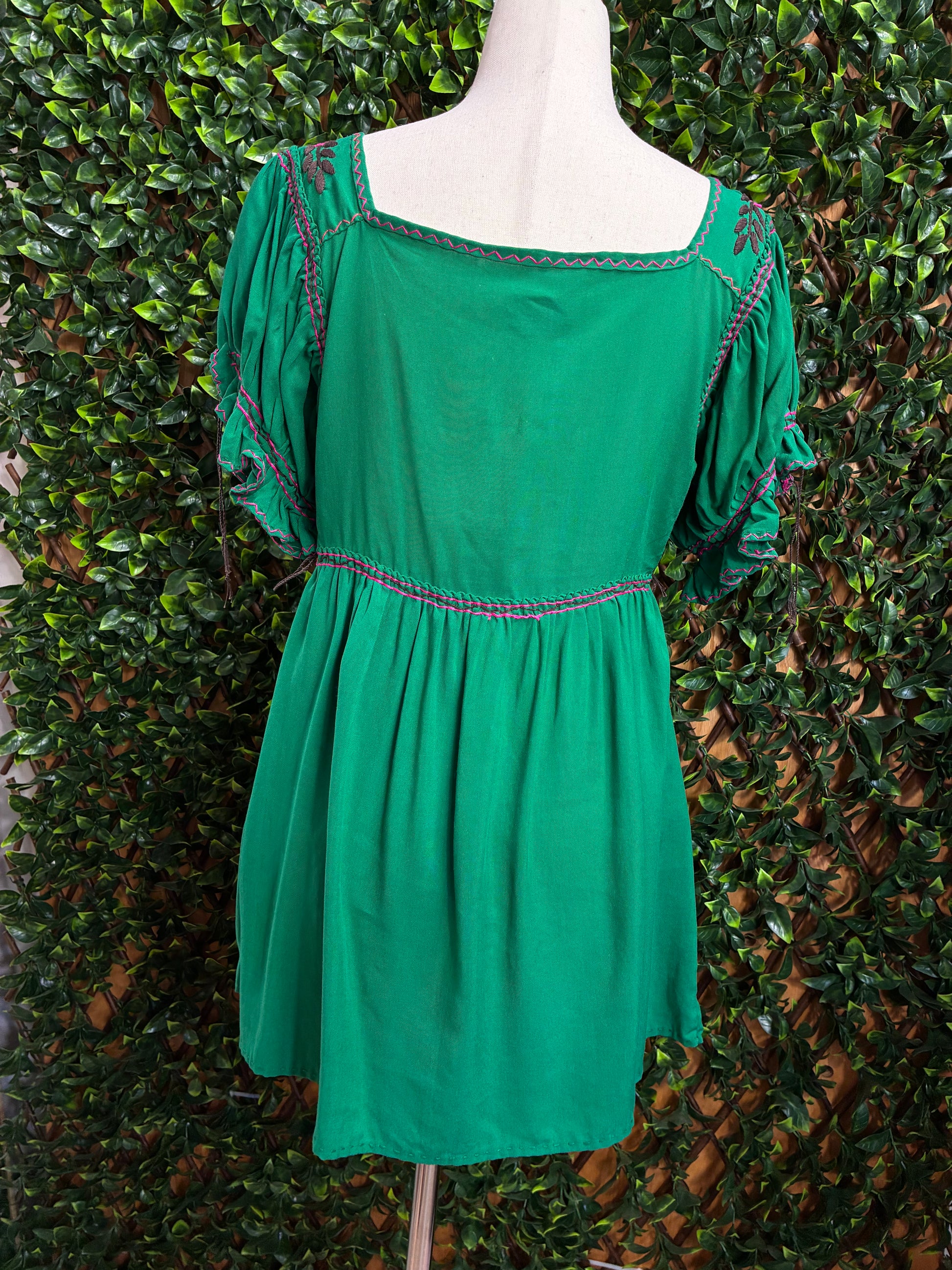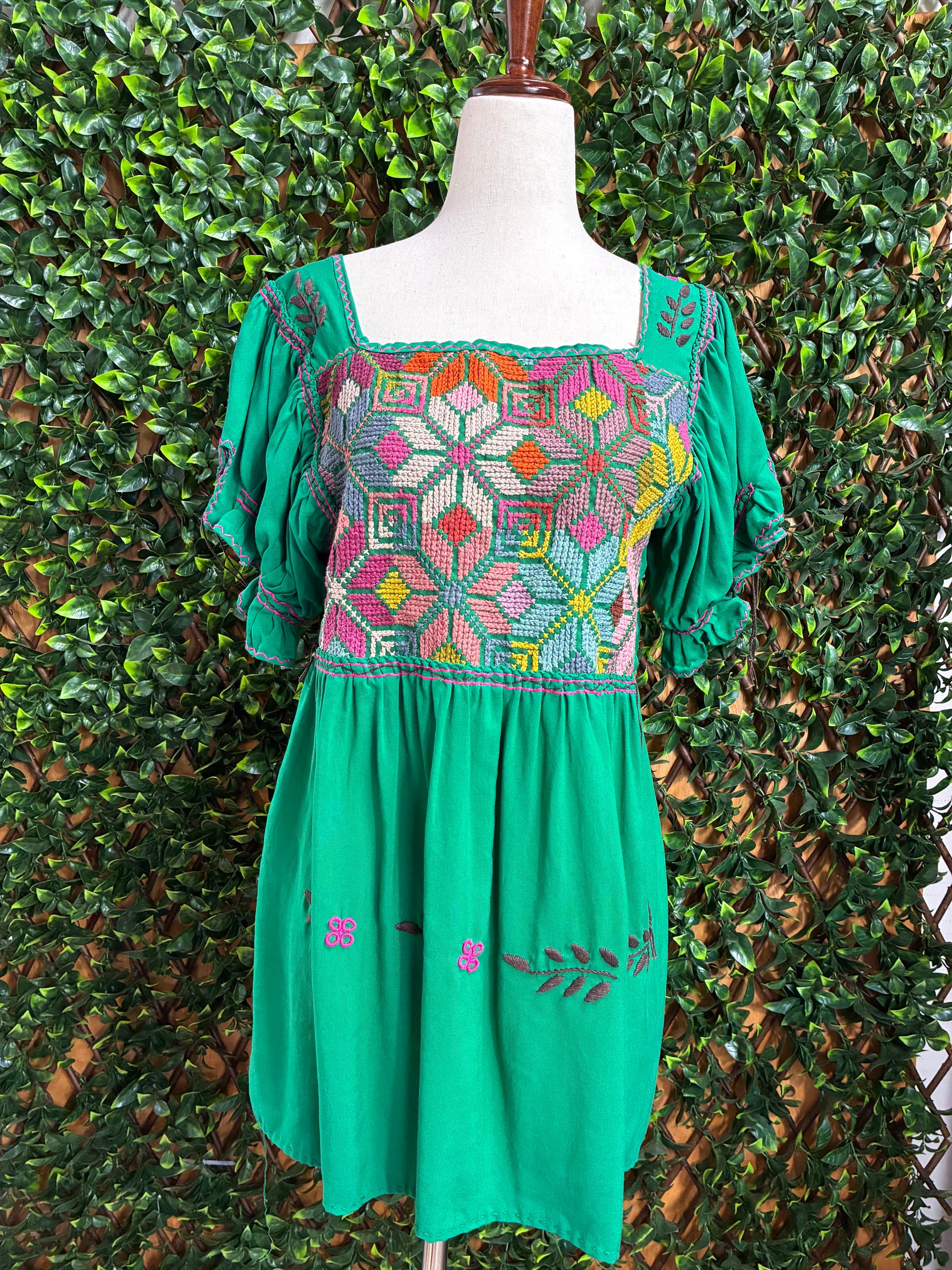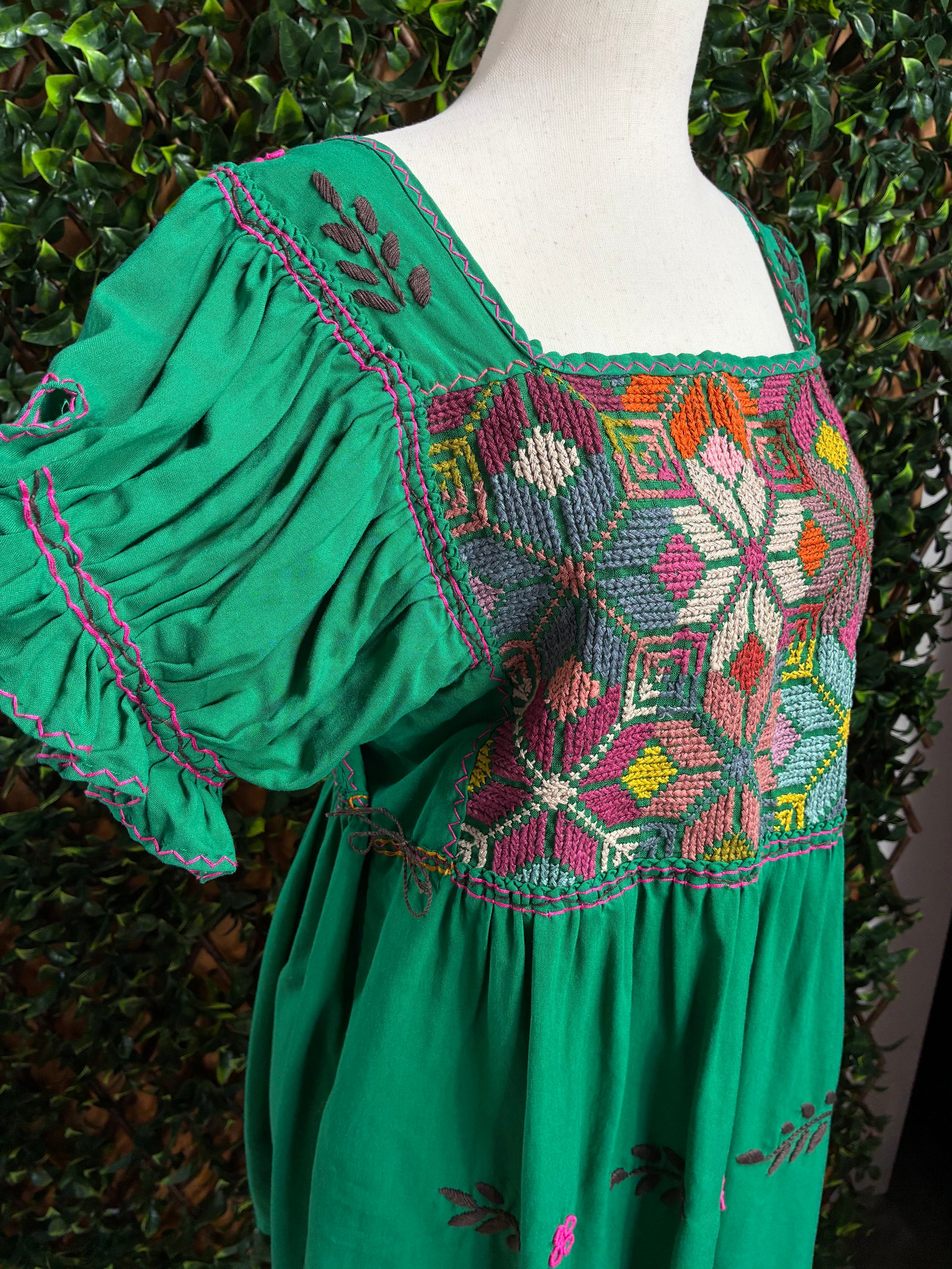 La pechera presenta un espectacular trabajo de punto de cruz con diseños florales y geométricos en tonos vibrantes de rosa, naranja, amarillo, blanco y turquesa que contrastan bellamente con el verde esmeralda de la base. Los cordones laterales ajustables permiten adaptar el blusón a tu figura. Los bordados florales dispersos en la parte inferior añaden un toque de color y movimiento.