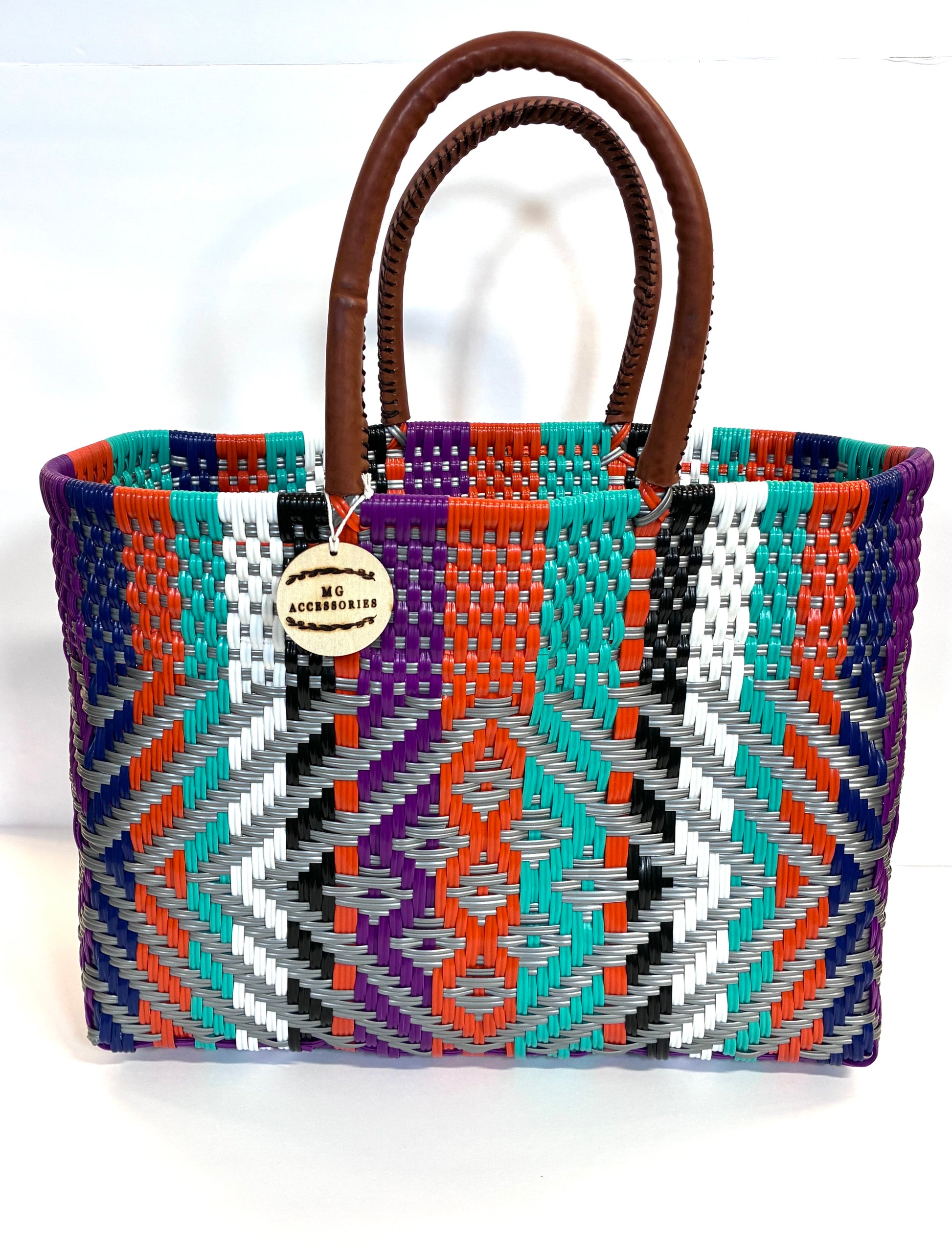 - Diseño tejido artesanal con vibrante patrón de zigzag multicolor en tonos morado, turquesa, naranja, negro y blanco