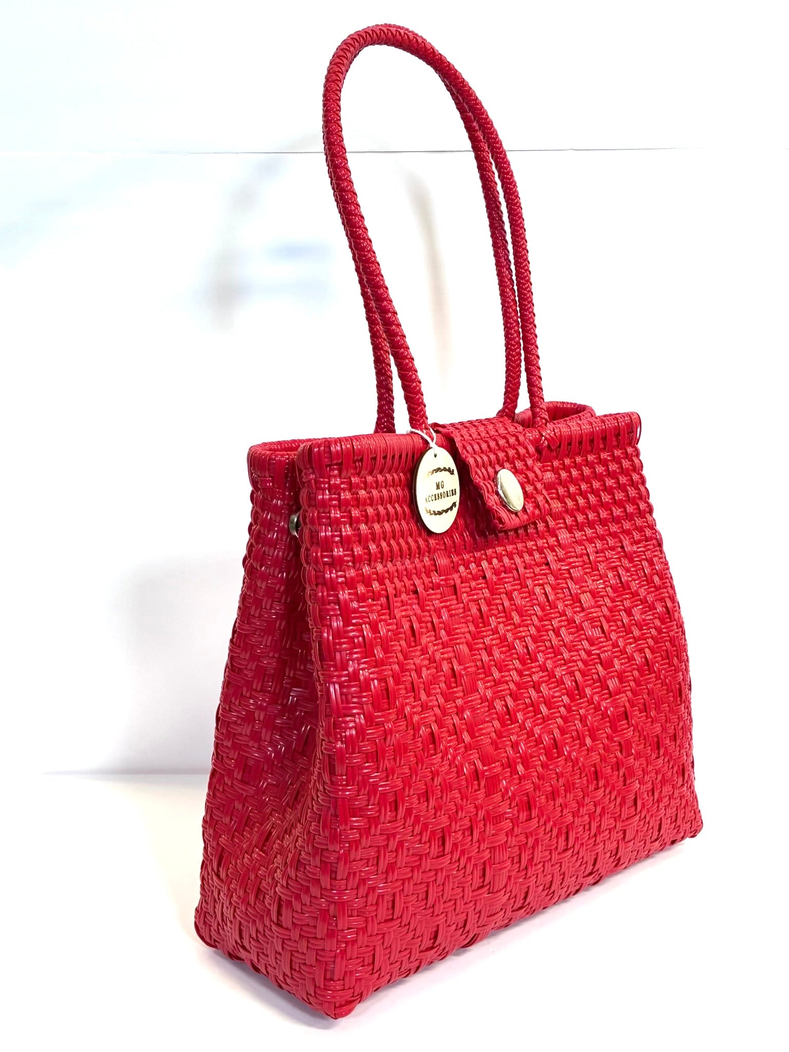 Esta versión en rojo intenso presenta un elegante patrón geométrico tejido que resalta la artesanía mexicana. Perfecta para el día a día, ir de compras o como bolsa de playa.
