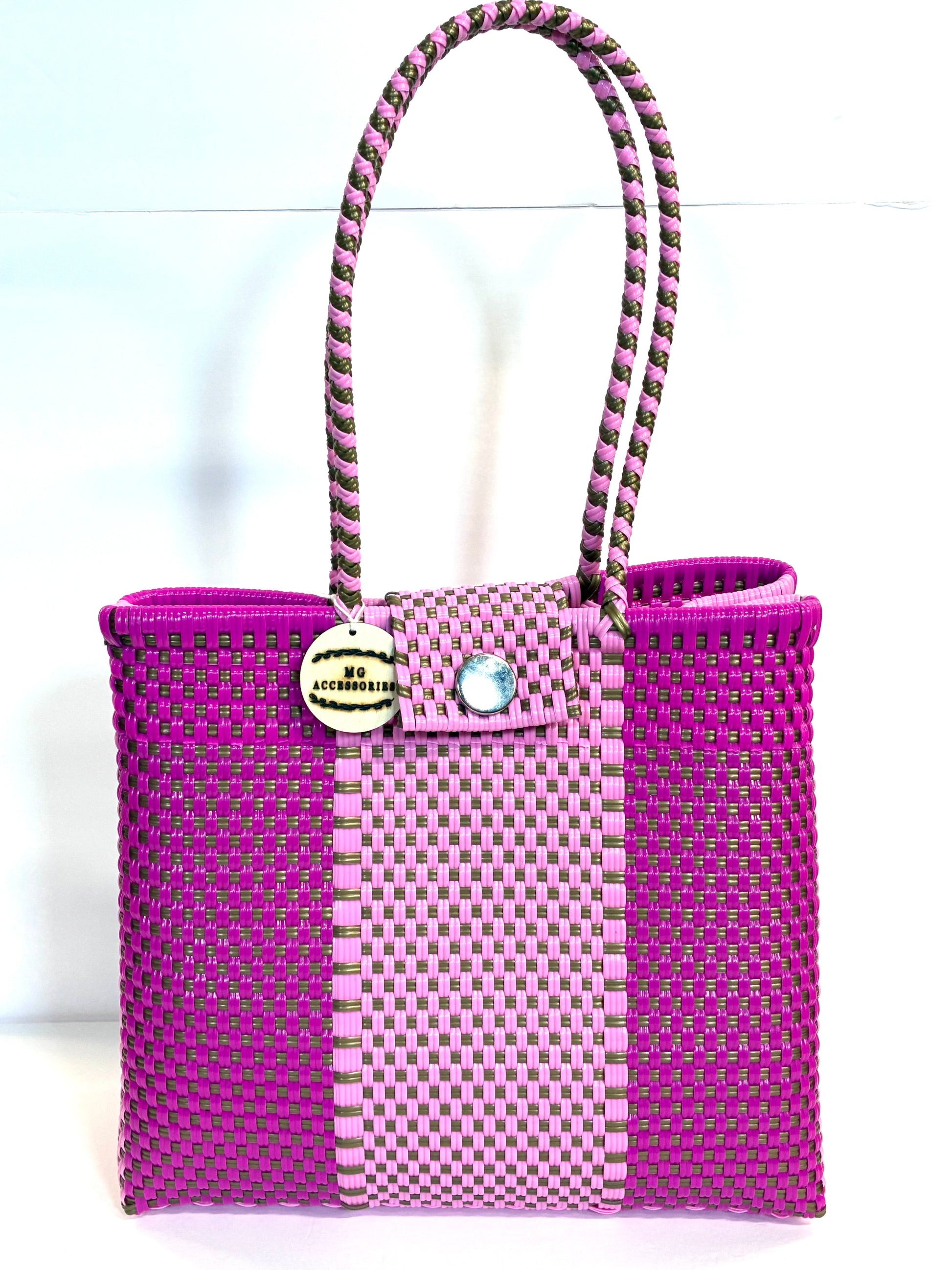 Esta elegante versión presenta un hermoso diseño en tonos rosa vibrante combinados con detalles en oro, creando un patrón geométrico sofisticado que resalta la artesanía mexicana. Perfecta para el día a día, ir de compras o como bolsa de playa.