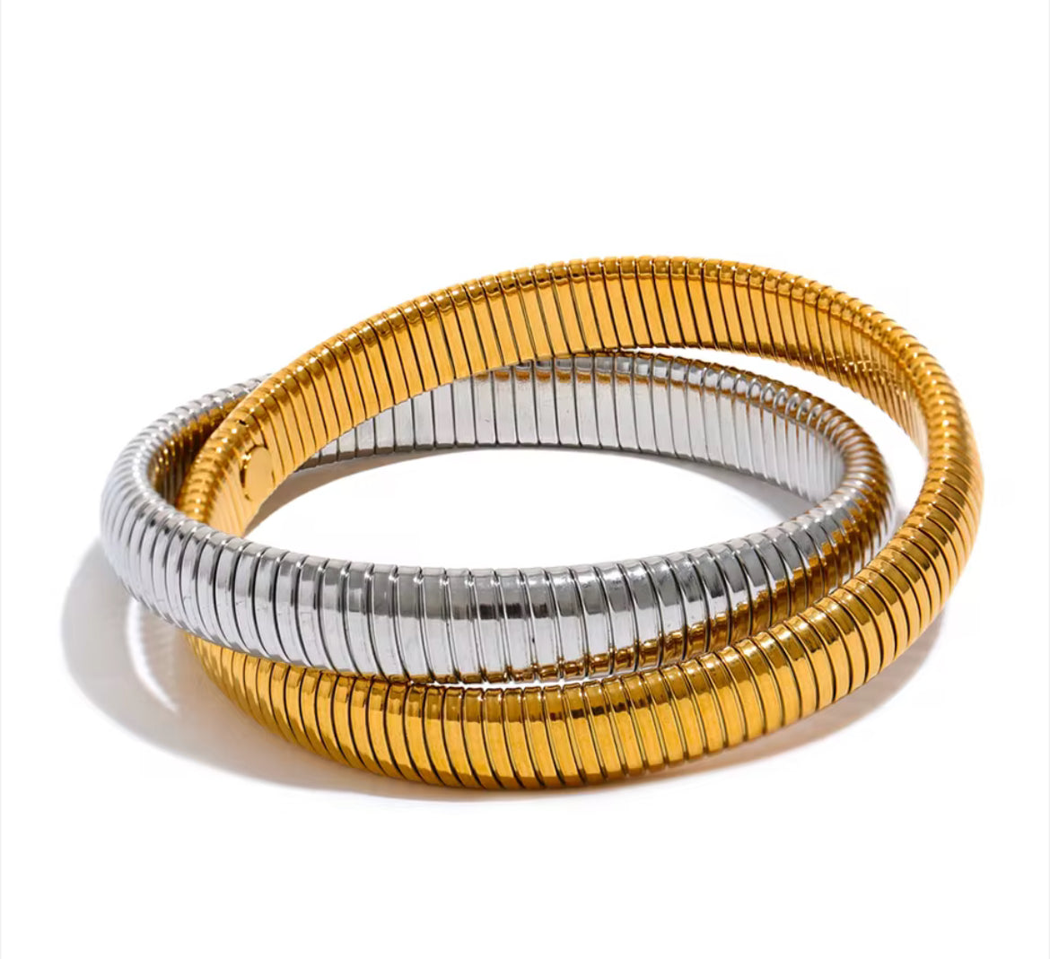 Estos brazaletes elásticos de metal mixto combinan la elegancia del oro y la plata en un diseño moderno tipo resorte que se adapta perfectamente a tu muñeca. Disponibles en tres grosores diferentes, cada uno ofrece un nivel distinto de presencia y estilo para complementar tu look personal.