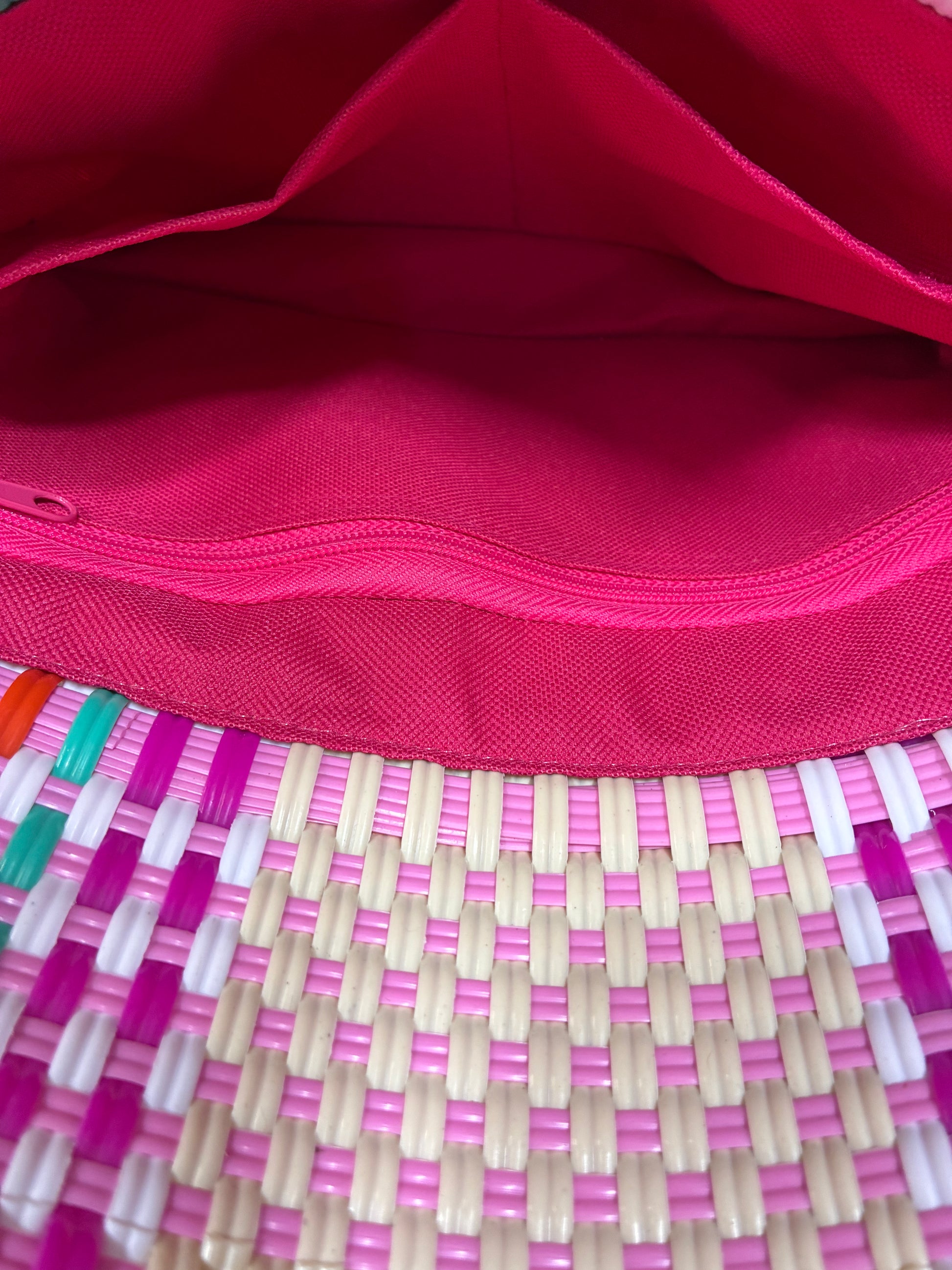 Nota: Por ser un producto artesanal con mezcla de colores en plástico reciclado, cada pieza puede presentar ligeras variaciones en la distribución de los tonos rosa, blanco, naranja y menta, lo que la hace única y especial.