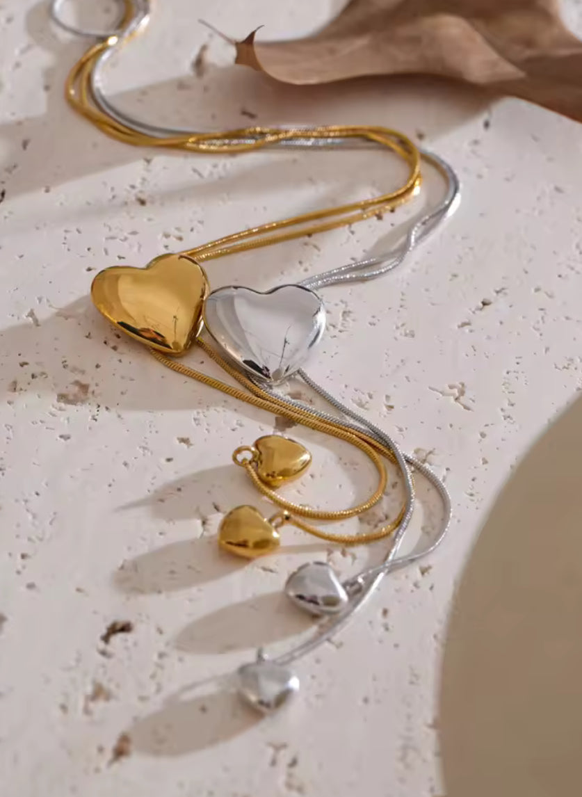 Este corbatín ajustable es una pieza versátil y moderna que combina el estilo clásico del corbatín con un toque romántico. El diseño de corazón pulido refleja la luz de manera hermosa, mientras que la cadena tipo serpiente le da un acabado elegante y fluido.