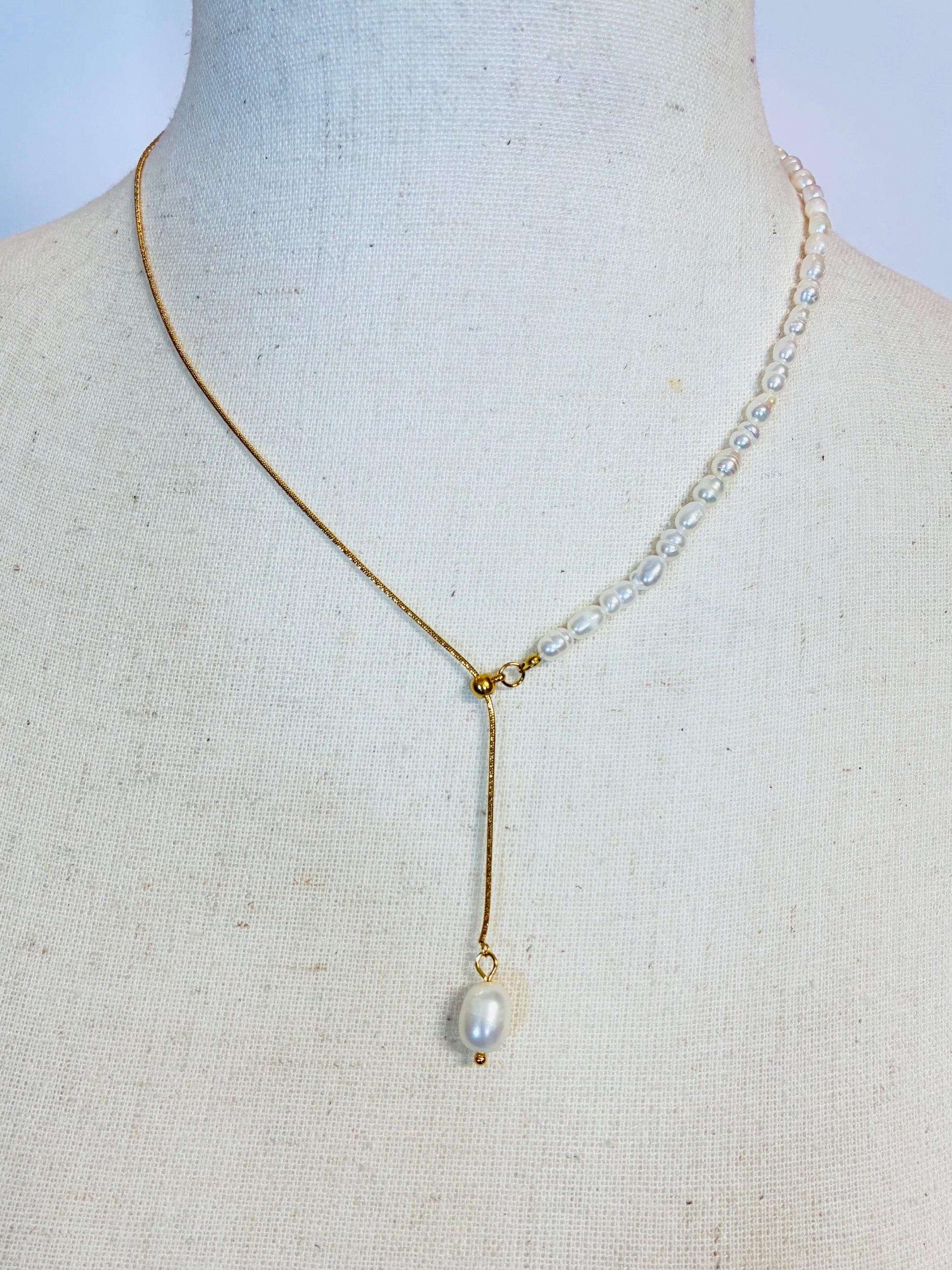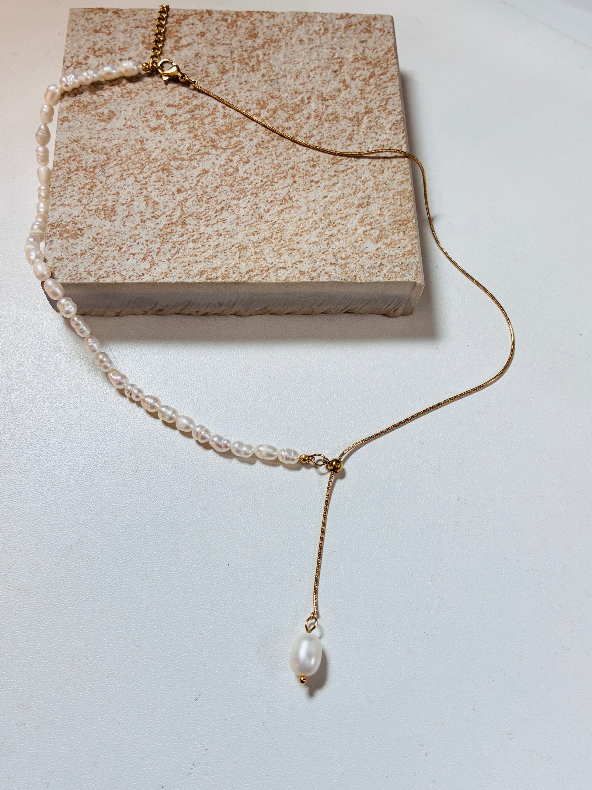 - Cadena dual: Diseño asimétrico con cadena plana bañada en oro real y cadena de perlas