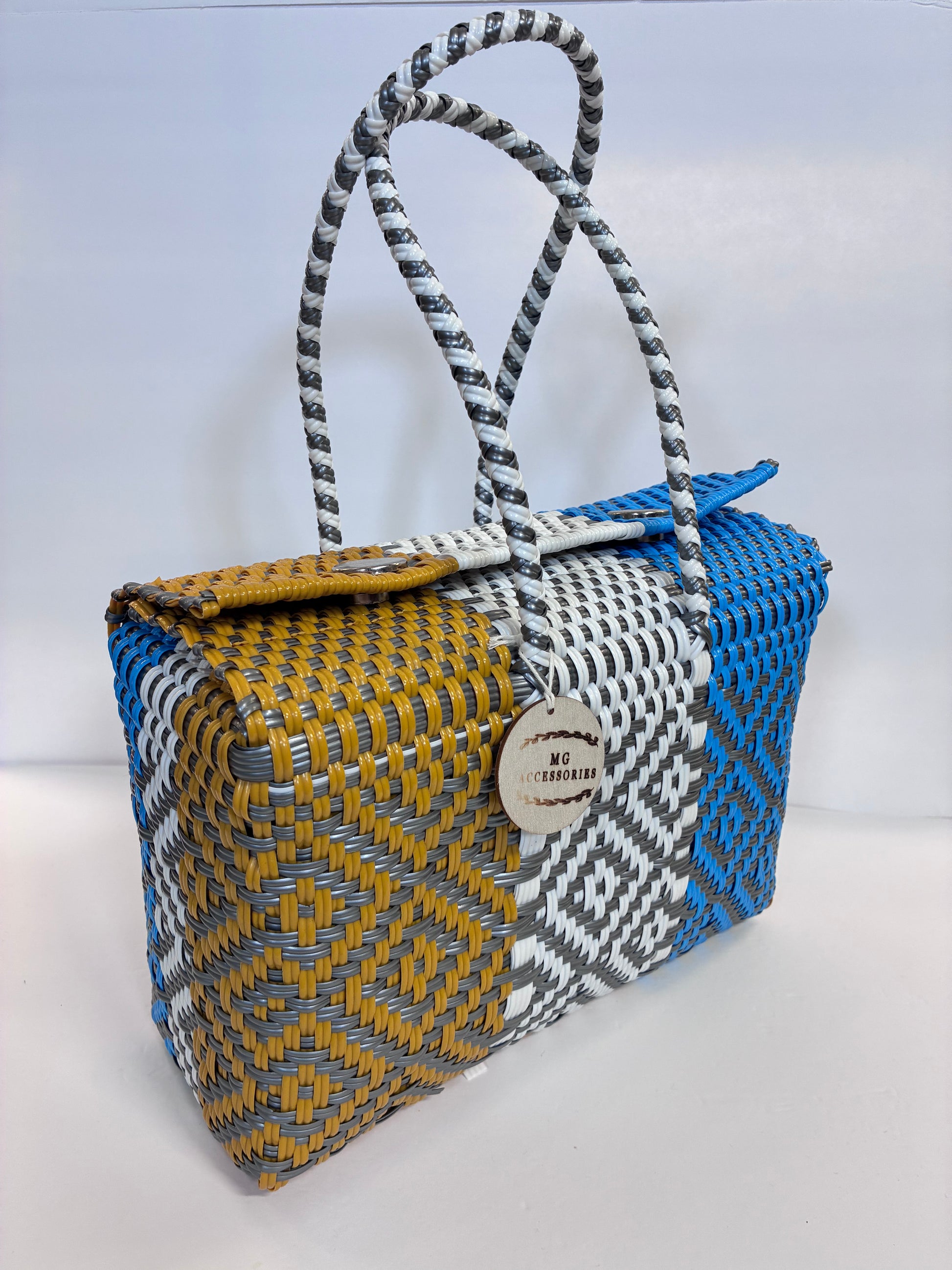 Esta hermosa bolsa tejida combina funcionalidad y sostenibilidad. Elaborada completamente a mano por artesanos mexicanos utilizando plástico reciclado en colores amarillo mostaza, blanco, azul y gris de fondo, cada pieza es única y contribuye al cuidado del medio ambiente.