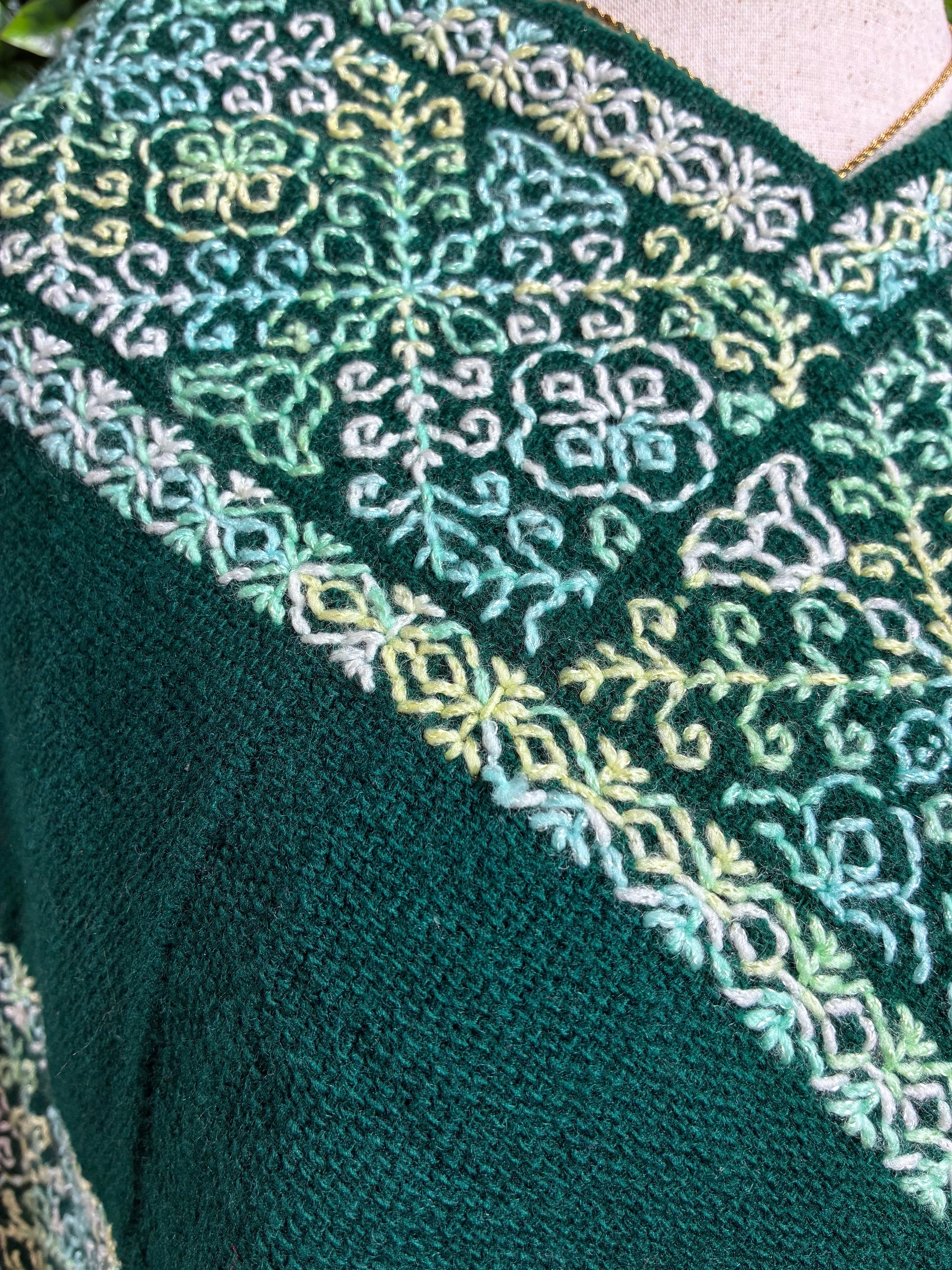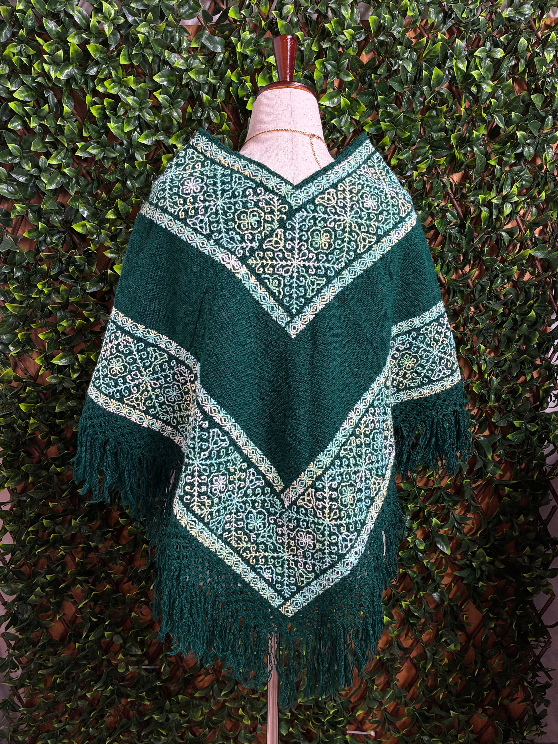 Hermosa mañanita o poncho mexicano elaborado artesanalmente en color verde con exquisito bordado a mano en diseños tradicionales blancos y flecos largos.