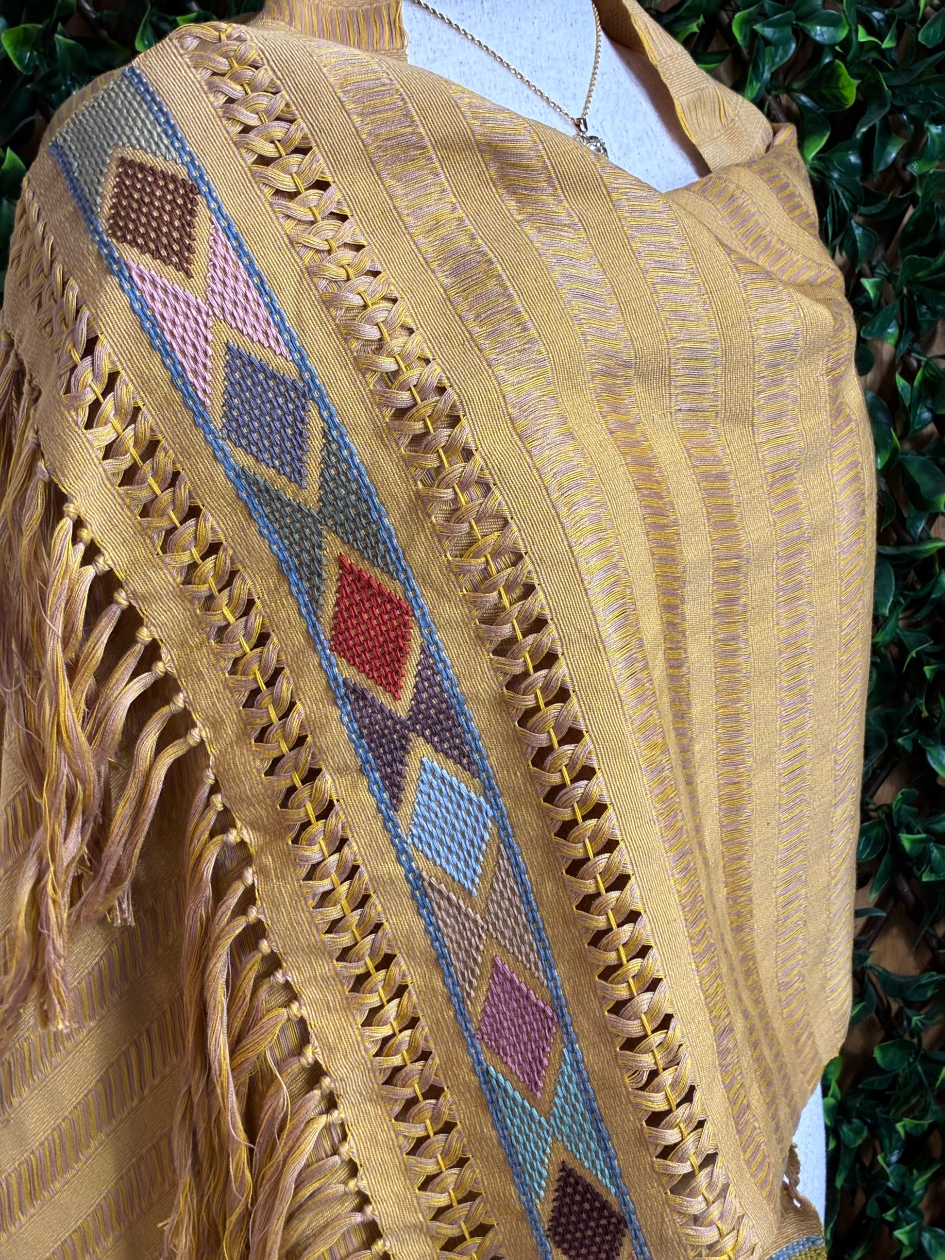 Rebozo Artesanal de Telar de Cintura - Dorado con Detalles Multicolor